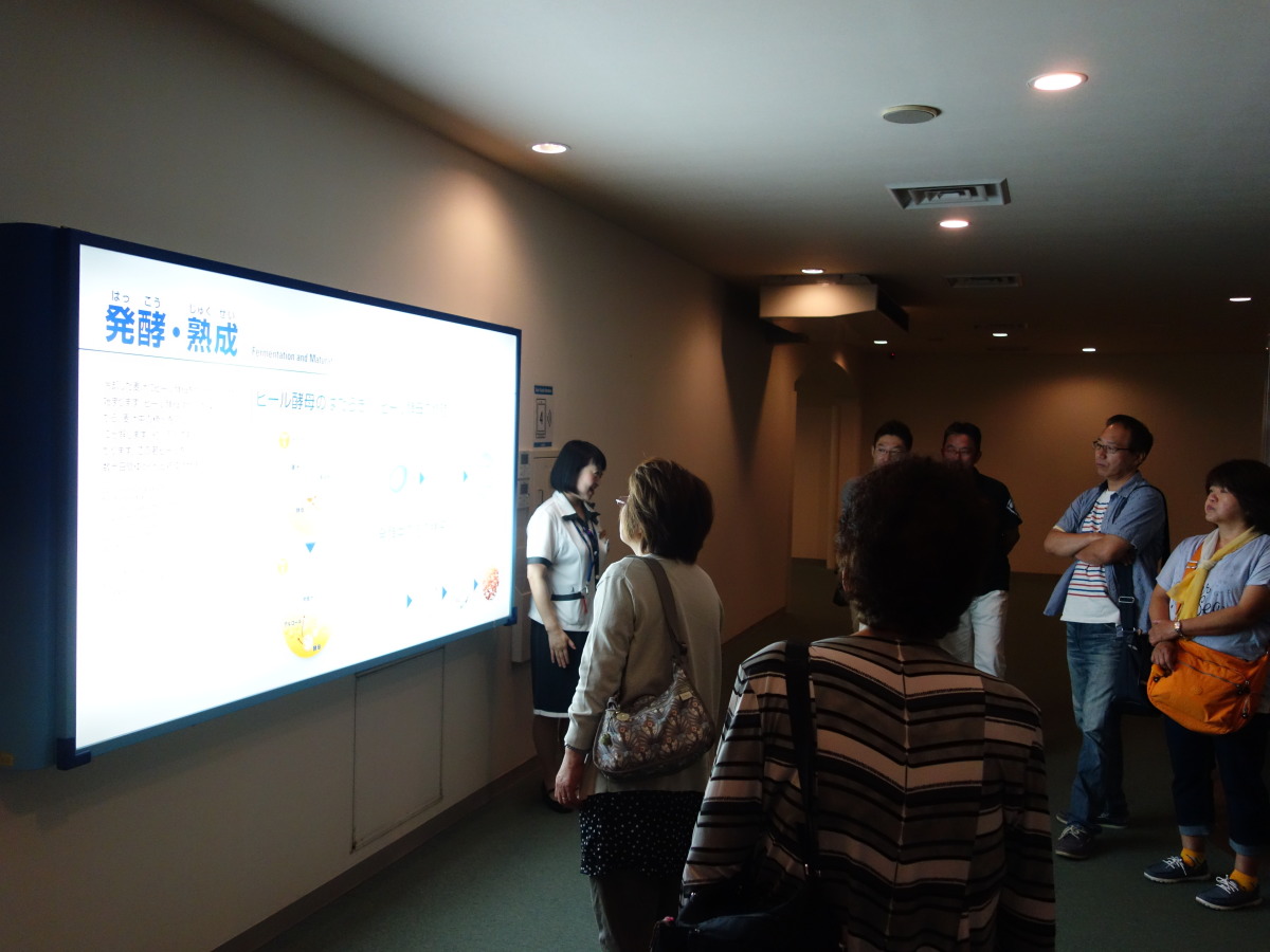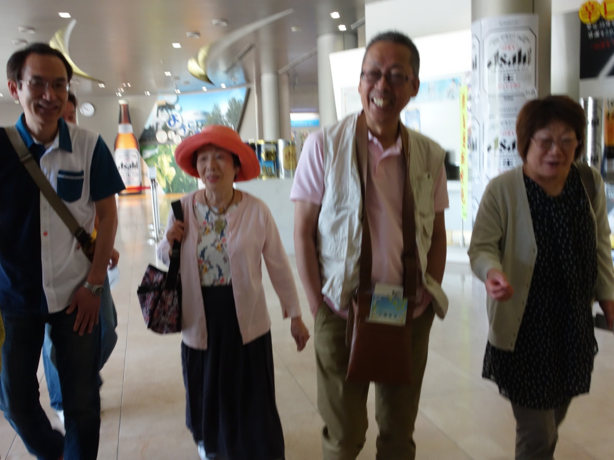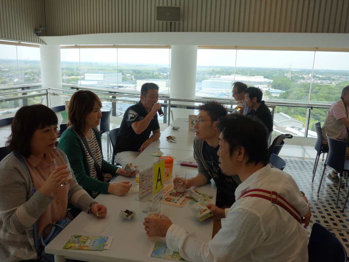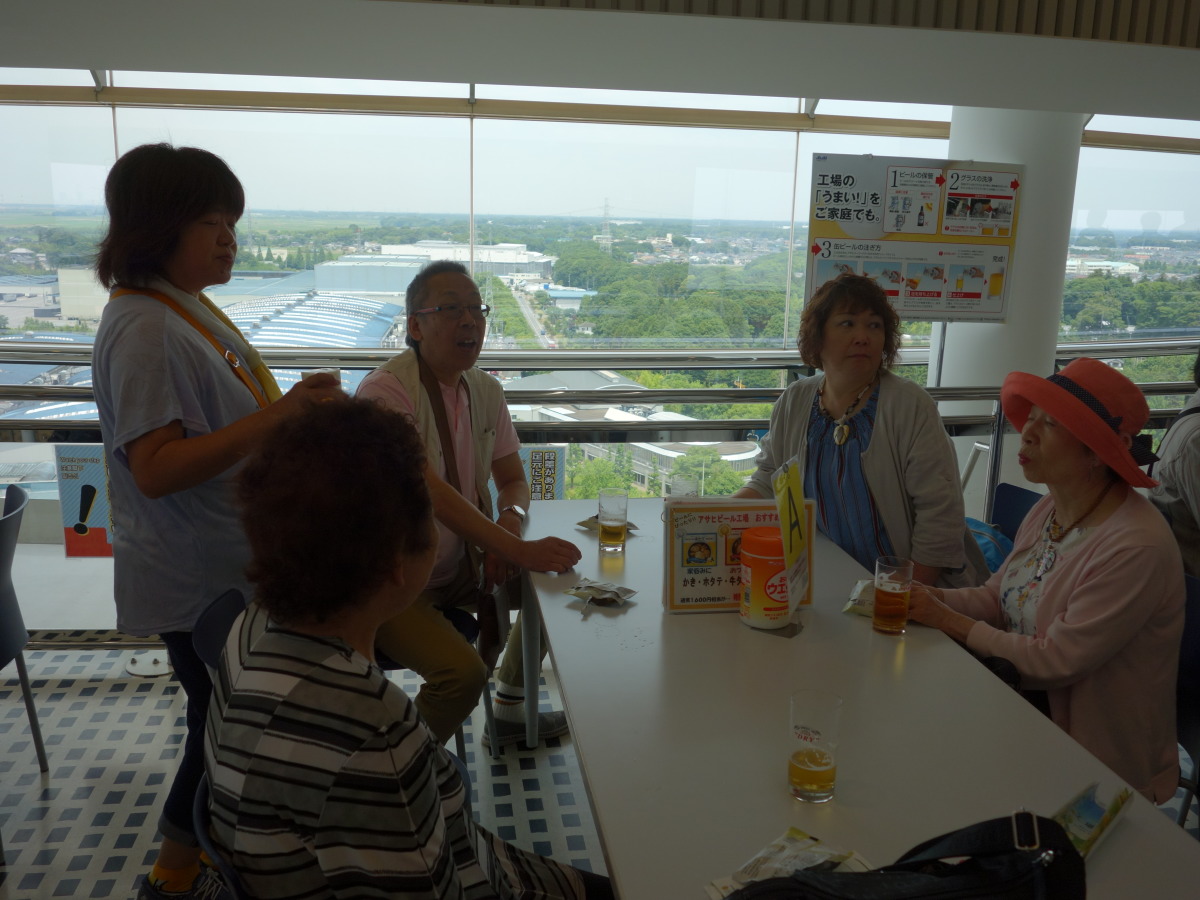 工場見学の最後は、地上60メートルの展望会場で出来立てビールの試飲です。お昼前に皆さんほろ酔いでいい気分になっていました。