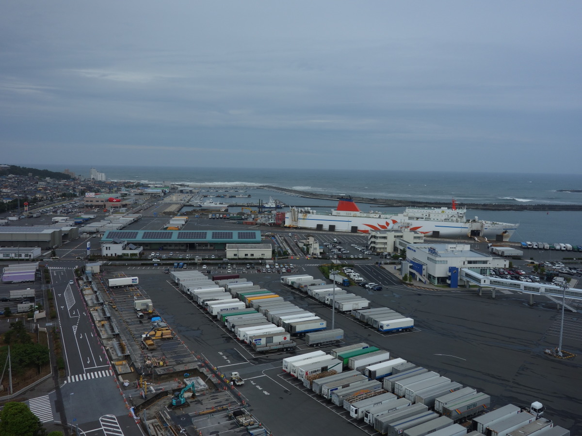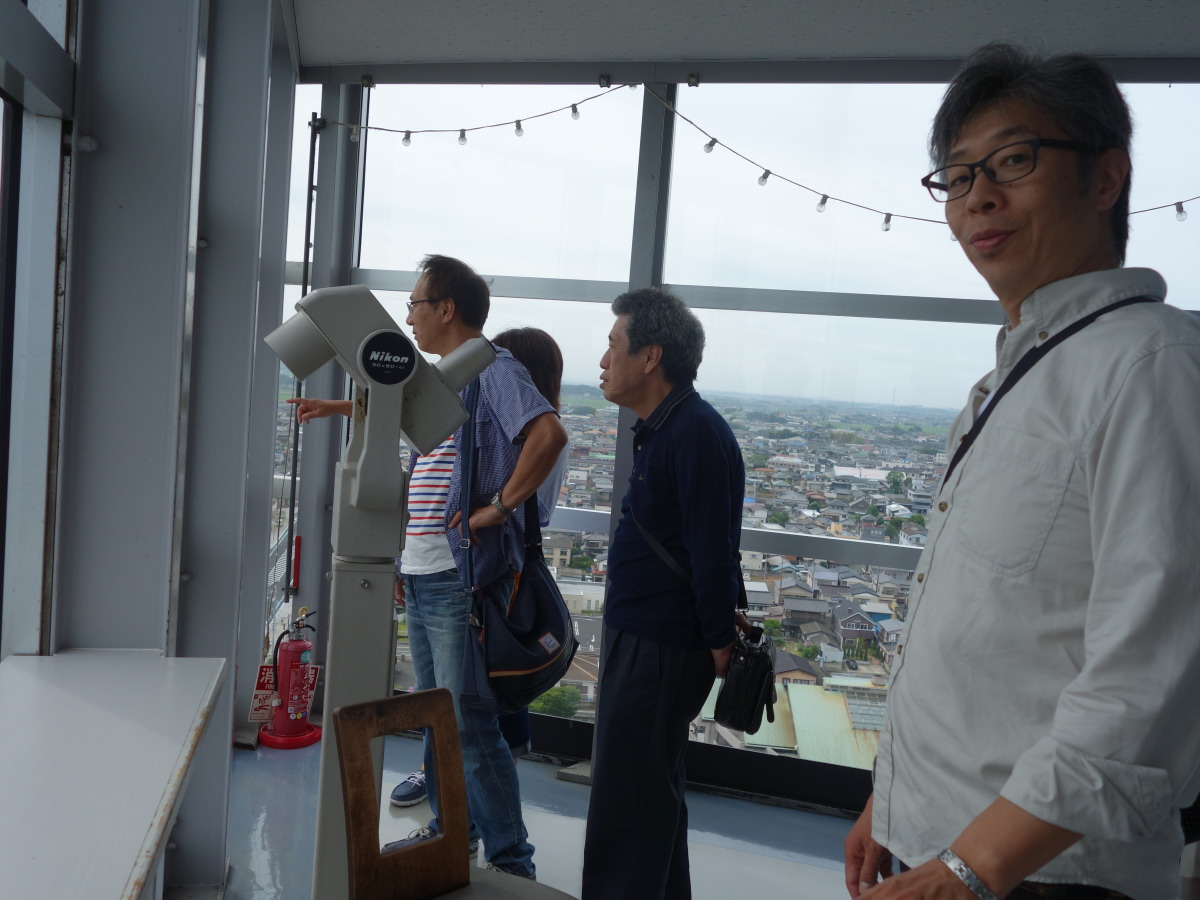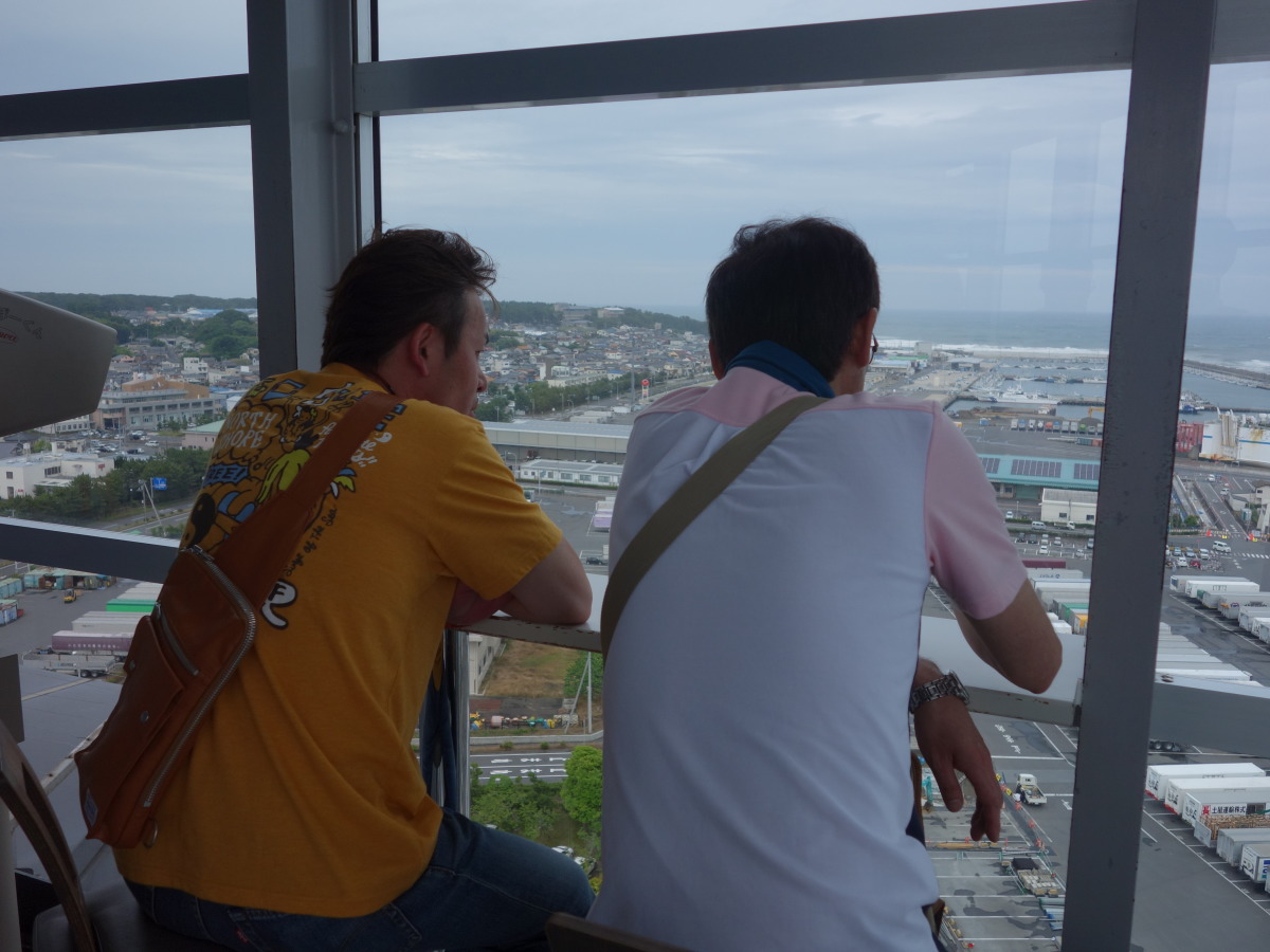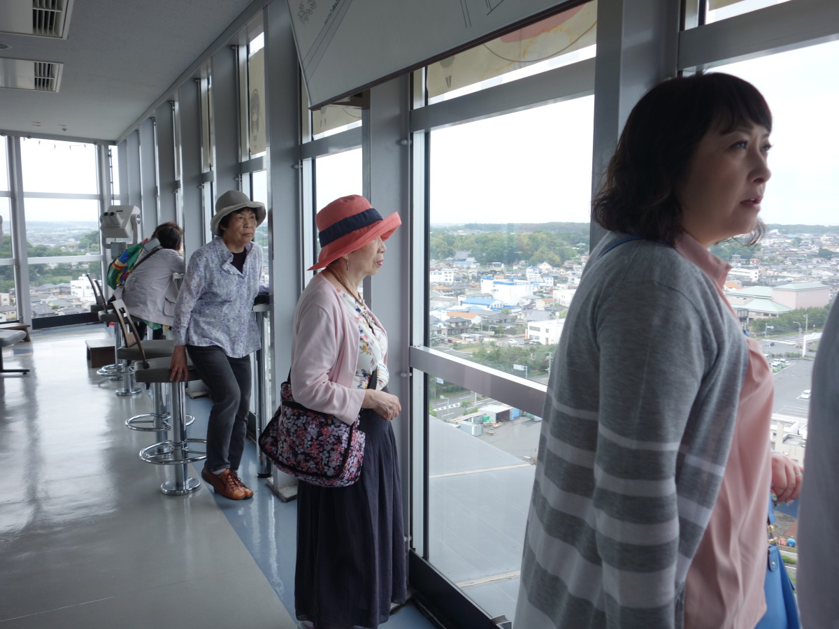 その後、大洗タワーに移動。ここは地上60メートルから太平洋を一望できる展望で有名です。が、当日は梅雨の真っ只中で、雨こそ降っていませんがどんよりと曇り、波も高く防波堤に打ちつける波が高くしぶきを上げていました。
