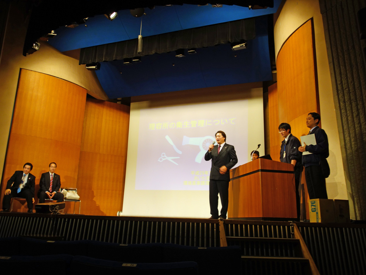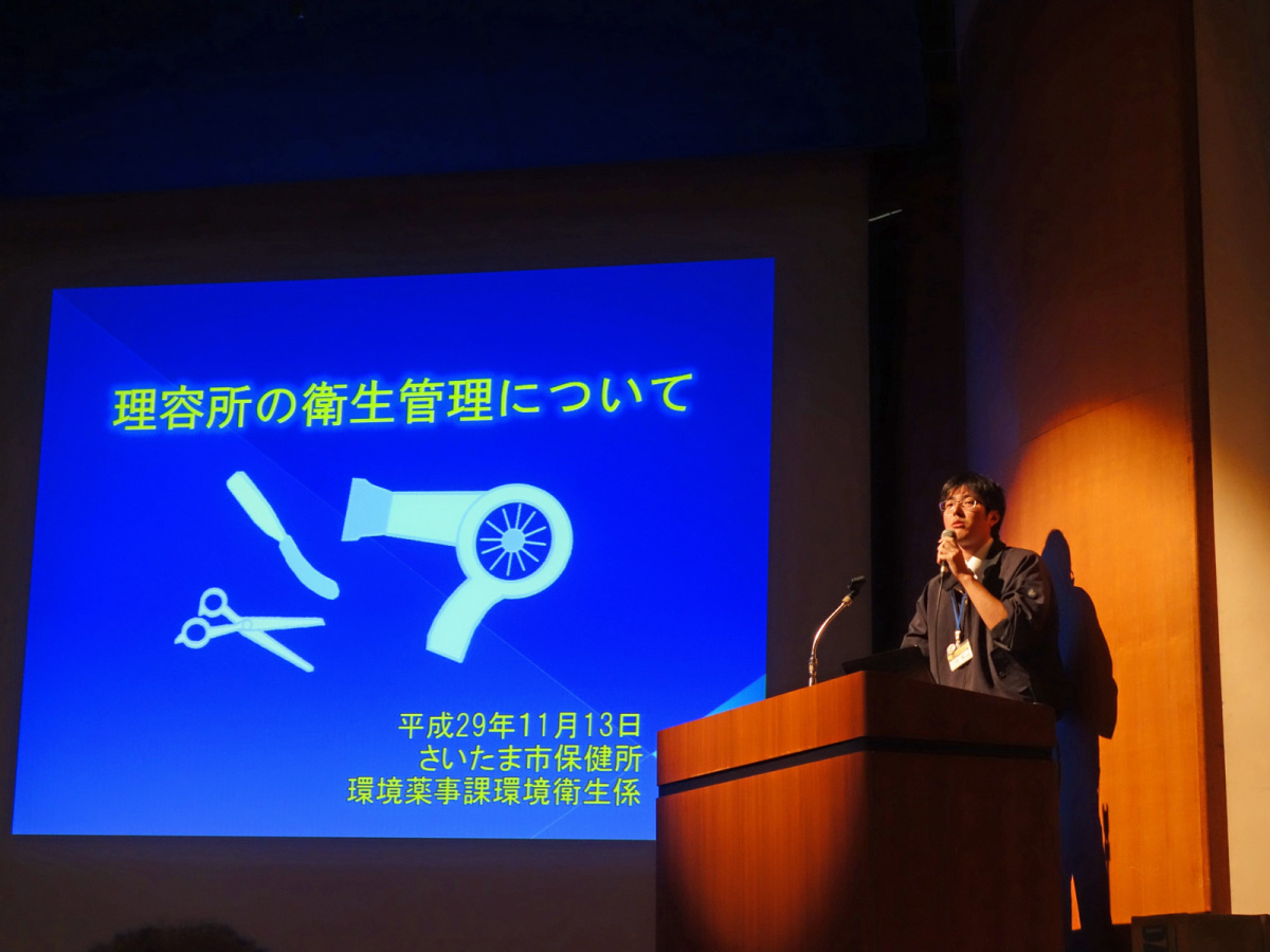 『理容所の衛生管理について』 さいたま市保健所 環境薬事課 環境衛生係 小泉潤一講師 出席数:56名 内容:『最近の法改正などについて』 『開設後の届出等について』 『出張理容について』 『アタマジラミについて』 『器具の消毒について』