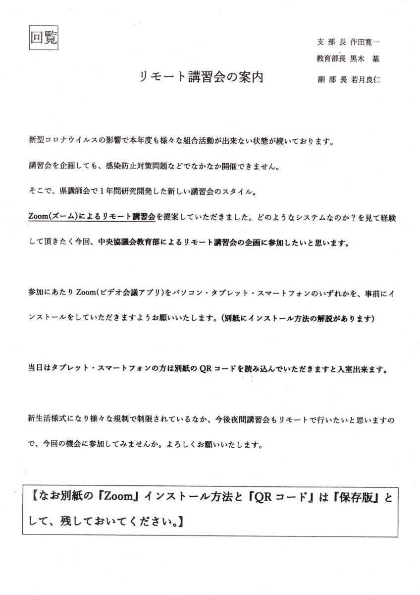 〈教育部よりZOOMを使ったリモート講習会のご案内です〉